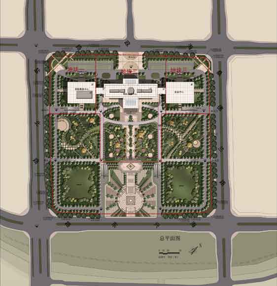 裙房顶部,延用“山水”概念,高度不一的庭院,由南向北降低,渐向地面景观区域铺展,最终与东北部50m宽的景观公园融为一体。