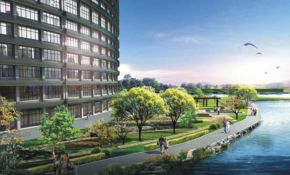 设计理念“自然山水”源于杭州“三面云山一面城”的独特地理格局。建筑包括一座主写字楼(含酒店)和四座写字楼。主楼体块错落有致,拟天然山石层峦叠嶂之态。各体块立面以多种水平线条构成不同肌理,并暗示地质层的丰富变化。外墙材质采用铝合金玻璃幕墙和石材幕墙,从而呈现稳重而犀利的面貌。每栋建筑有最佳景观的朝向设计,且各楼空间呼应,形成和谐的整体,与一期如水韵动的建筑形式,组成山水相依之势;同时也将为新区最终构成“背山面水、藏风聚气”的总体布局。